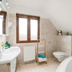 Druhá koupelna s vanou a toaletou (5,72 m2) doplňuje komfort celého patra. V koupelně radiátor a topný žebřík.