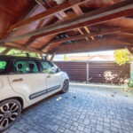 Technická místnost (6 m2) v zadní části domu, parkovací přístřešek pro dvě auta.