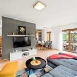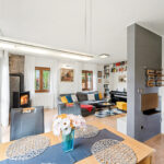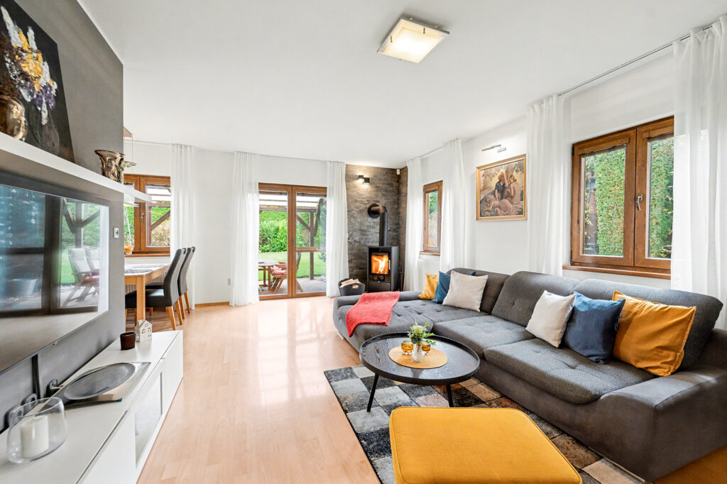 Poté se nám otevře prostor zádveří, ze kterého vejdeme do prostorného obývacího pokoje s kuchyní a krbem (33 m2), který dodává domovu teplo i atmosféru. Z útulného obývacího pokoje je přímý vstup na krytou terasu (17 m2) a krásně udržovanou zahradu. Oceníte zde příjemné posezení nejen v jarních v letních měsících.