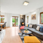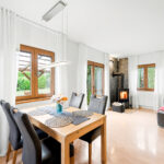 Obývací pokoj příjemně navazuje na moderní kuchyňskou linku, prakticky propojena s jídelní částí, ideální pro rodinné vaření a posezení. Kuchyň vybavena značkovými spotřebiči (myčka Bosch, horkovzdušná trouba Electrolux, plynová varná deska, mikrovlnka Electrolux a lednice Liebherr). Vedle kuchyně se nachází spíž (3,22 m2), další úložný prostor.