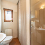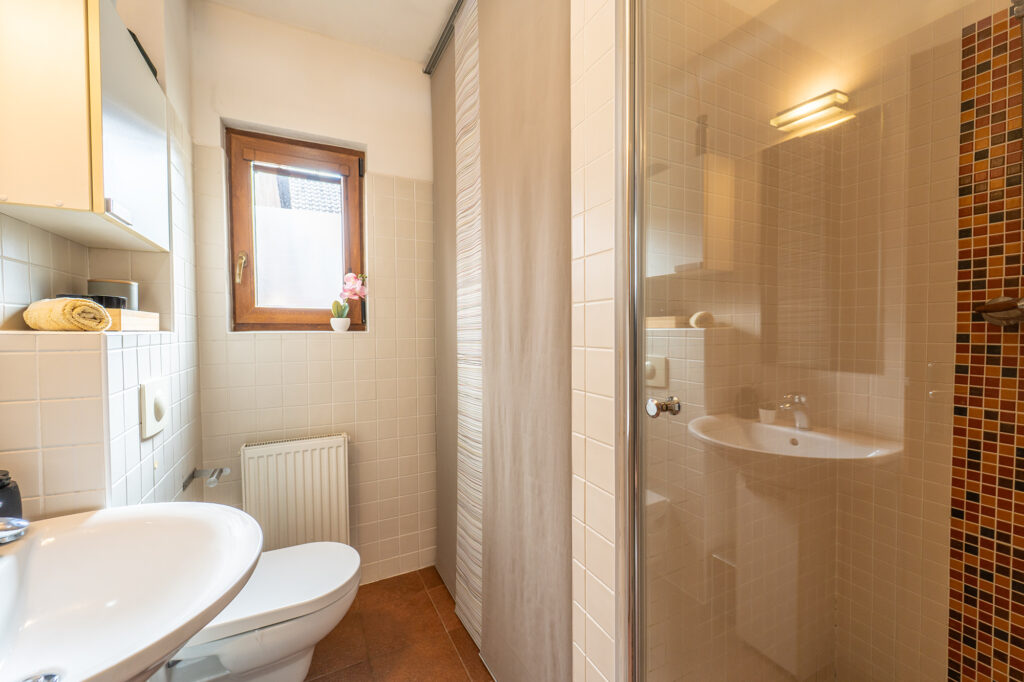 Chodbou dále pokračujeme do praktické koupelny se sprchovým koutem a toaletou (4,42 m2), v zadní části pračka se sušičkou a plynový kondenzační kotel Baxi.