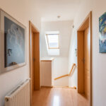 V patře domu se nachází tři pokoje, šatna a druhá koupelna s vanou a toaletou.